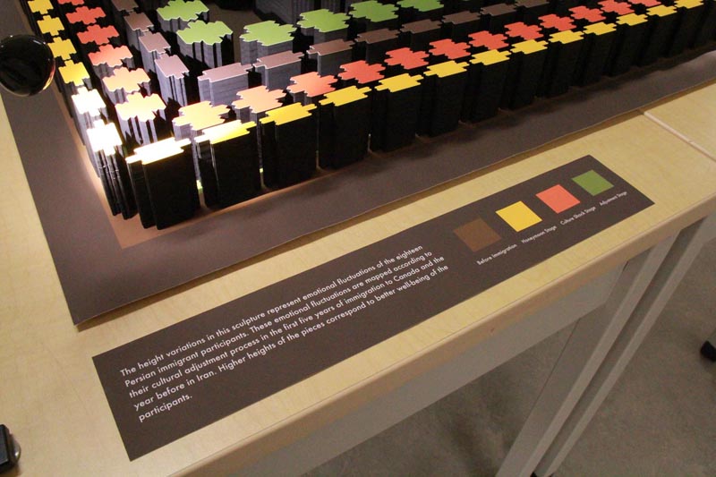 The outcomes of this study are innovative forms of the Persian rug as a visual representation of a sign system which enables viewers to observe the visual narrative of the emotional life of Persian immigrants in Canada as semiotic phenomena. In this study, emotional reactions of sample participants throughout their cultural adjustment process were examined through a questionnaire. Subsequently, the data gathered was visualized to create a motif for each participant through a specific system. The motifs were arranged according to the traditional set-structure of Persian rug design. Three modalities of data visualization were chosen for the outcomes of this study: sculpture, animation, and sound.